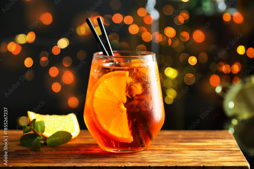 • Refreshing spritzer cocktail, mint and orange slice on wooden table in bar, closeup