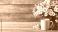 • A cozy scene featuring a steaming cup of coffee placed next to a lively bouquet of daisies, perfectly capturing warmth and inviting ambiance in a rustic setting.