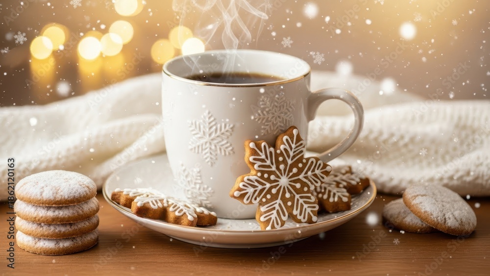 • Winter Warmth: Steaming coffee meets festive cookies on a cozy winter scene, evoking feelings of comfort, holiday cheer, and delightful flavors.