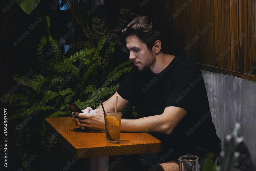 Do Restauracji - Adult caucasian male at cozy cafe with smartphone and iced drink in relaxed setting #1864367377