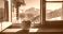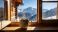 • Steaming cup of hot coffee on wooden window sill with snowy mountain view background in winter cabin