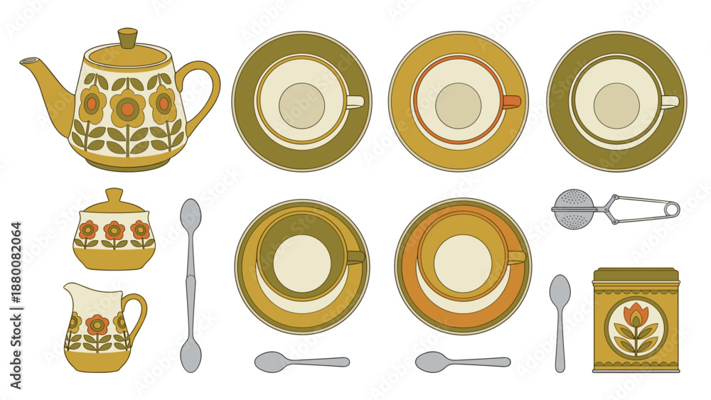 Do Restauracji - Vintage tea set vector illustration. Retro 70s floral pattern kitchenware. Knolling layout teapot... #1880082064