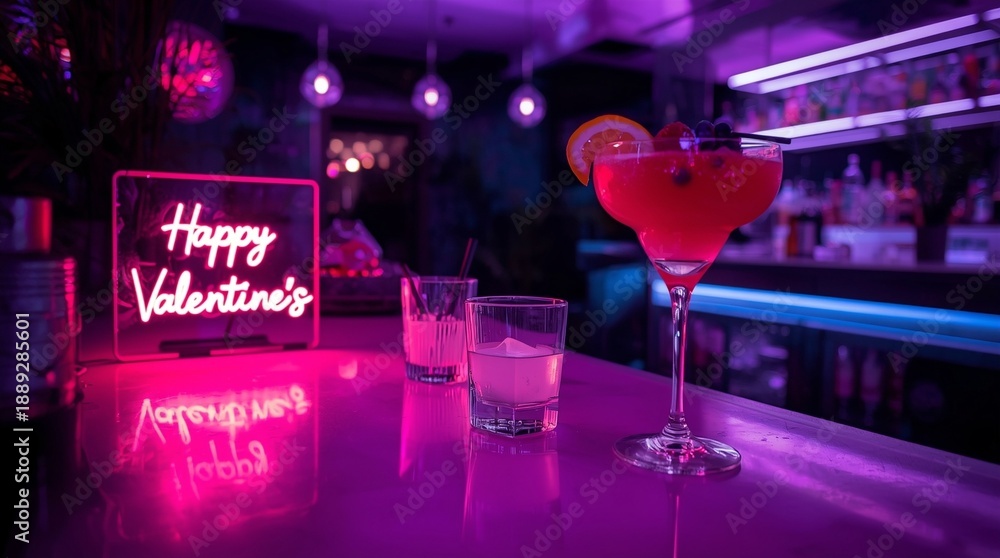Do Restauracji - Valentine’s Day Night Bar Scene with Neon Lights and Pink Cocktail, Modern Romantic Party... #1889285601