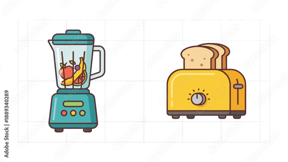 • Modern flat vector icons of kitchen appliances featuring a teal electric blender filled with fresh fruit and a yellow bread toaster with toast slices, isolated on a white grid background.