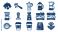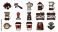 • Comprehensive Coffee Icon Set with Espresso Machine, Moka Pot, French Press, Pour Over, Grinder, Tamper, Takeaway Cups, Latte Art, Coffee Beans, and Plant in a Bold Outline Flat Illustration Style.