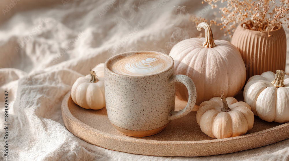 • Cozy autumn scene with latte art coffee, white pumpkins, and dried flowers on a textured tray in soft morning light, evoking warm fall vibes.