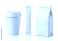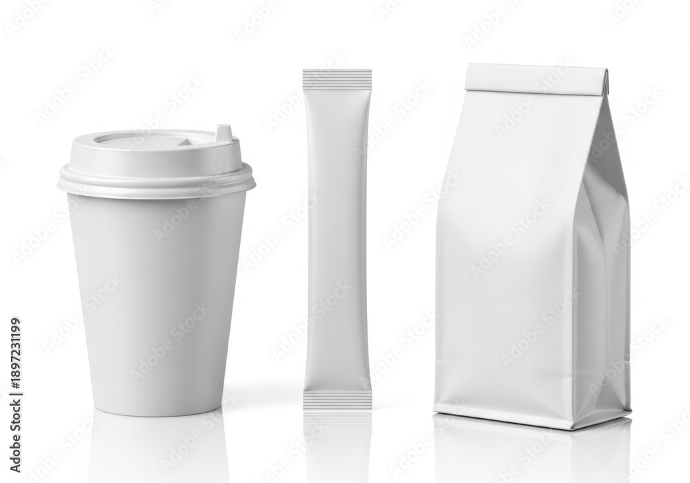 • White paper coffee cup with lid sugar packet and coffee bag isolated on white background