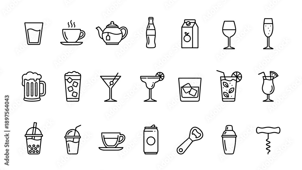 • Minimalist Beverage and Cocktail Line Icon Set Featuring Coffee, Tea, Beer, Wine, Soda, Juice, Bubble Tea, and Bar Tools like Shaker and Corkscrew. Perfect for Menu Design and App Interfaces.