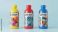 Three colorful drink bottles with abstract geometric labels on light blue background beverage liquid