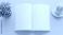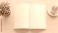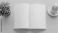 • Open book spread mockup with plant and coffee cup on wooden surface