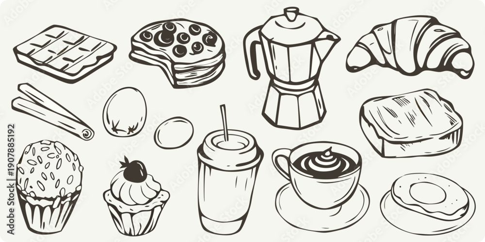 • A charming sketch of breakfast pastries coffee and sweet treats