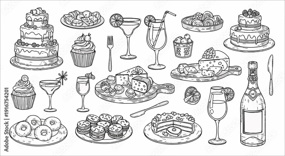 • Elegant Hand-Drawn Party Food and Drink Sketches - Celebration Treats Vector Illustration