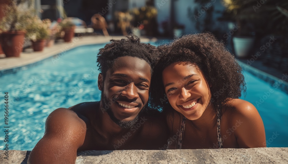 Do Restauracji - Happy Young African American Couple Leaning On Edge Of Swimming Pool In Their Backyard, Viewed... #1956664404