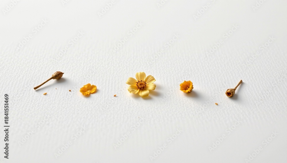 • A collage of images showcasing a sequence of a single yellow flower unfolding into bloom over time