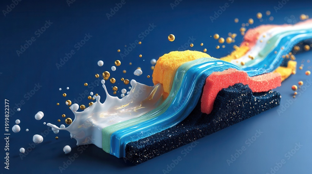 • Vibrant colorful sponge with liquid splash on dark blue background