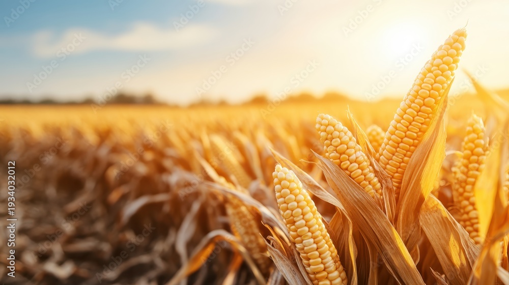 • This mesmerizing scene captures a field of corn ripening under a stunning sunset glow, representing agricultural richness and the beauty of nature in its most vibrant state.