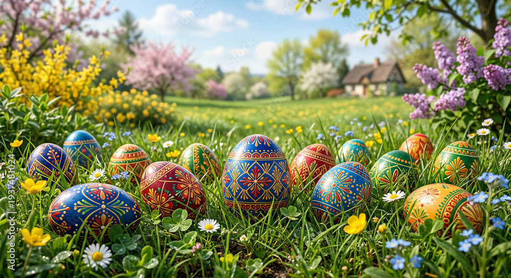 Do Sypialni - Kolorowe pisanki ukryte w trawie, w tle łąka i kwitnące drzewa. Tło wielkanocne #1937481024