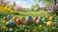 • Kolorowe pisanki ukryte w trawie, w tle łąka i kwitnące drzewa. Tło wielkanocne