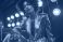 • Model poses in bold electric blue sequined suit under disco lights for a retro-futuristic vibe