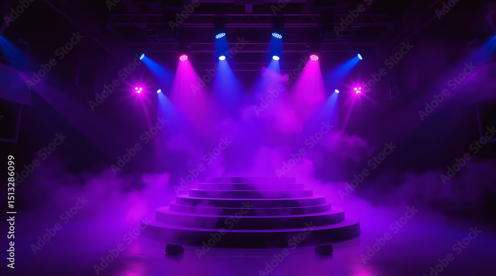 • Empty modern stage with blue purple neon spotlight. Stage light background with spotlight illuminated. Modern dance production stage. AI generated image. Perfect for music shows parties