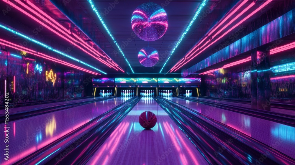 • Neon-lit bowling alley interior with a single ball at the center.