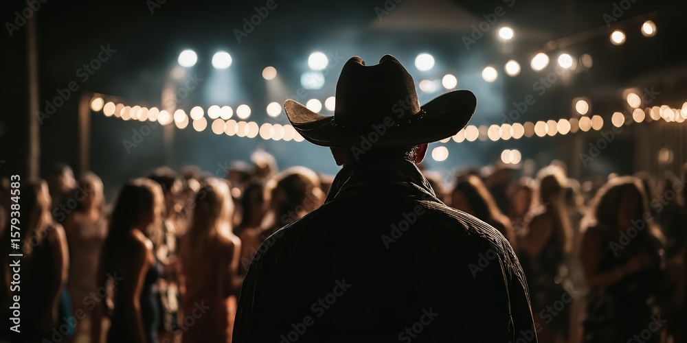 • Cowboy Watching Dancers at a Texas Country Club with Backlighting and Western Atmosphere