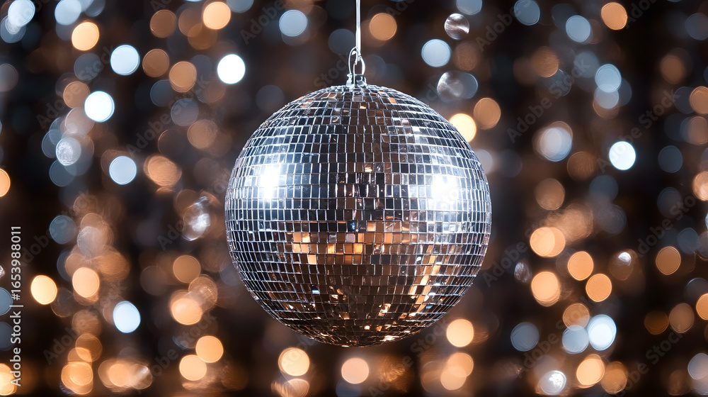 • Shimmering disco ball reflecting colorful lights at a lively dance event during the evening