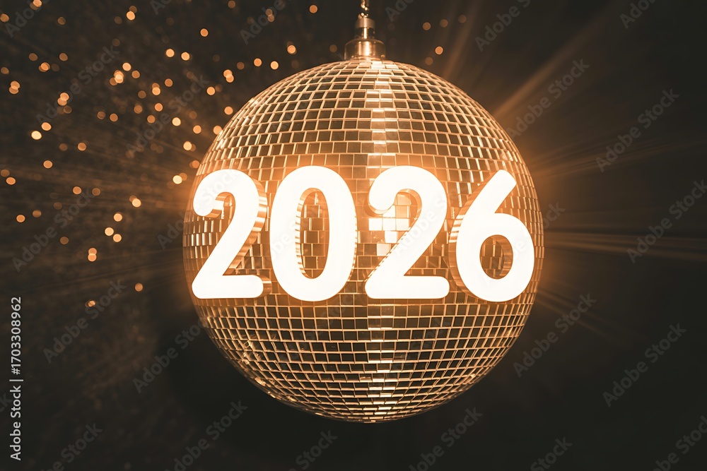 • Sparkling disco ball displays 2026 illuminating the future with bright festive celebration