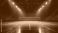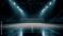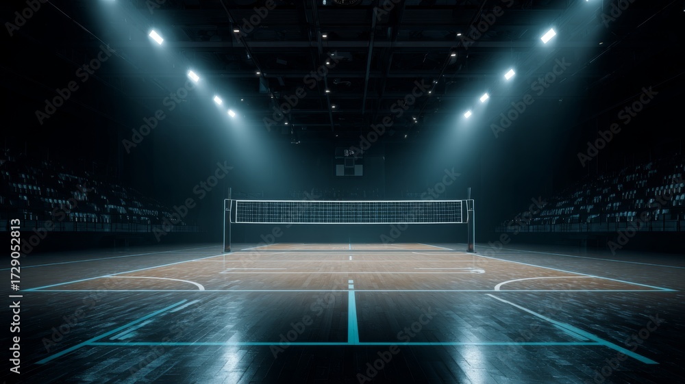 • Empty professional indoor volleyball court illuminated with bright arena lights ready for a match or training session