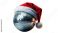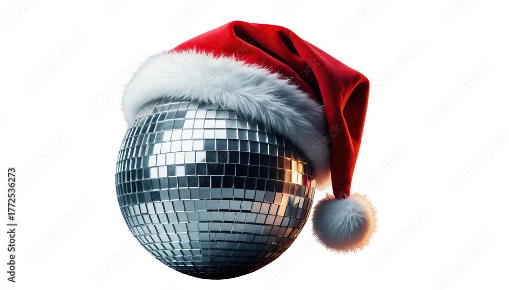 • Ultra-realistic silver disco ball covered in tiny mirrored glass tiles, wearing a red