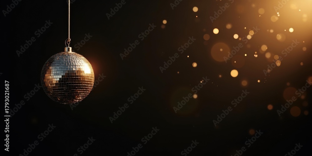 • Gold mirror disco ball on black — luxury New Year party banner, copy space