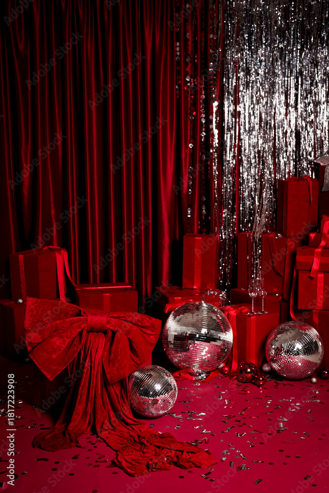• Red glamorous Christmas party scene with gifts, disco balls and silver tinsel