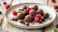 • fotografia deserów gourmet, czekoladowe trufle, mieszane owoce jagodowe, jadalne kwiaty, luksusowy talerz deserowy, naturalne oświetlenie, delikatna porcelana, drewniany stół, miękkie rozproszone świa