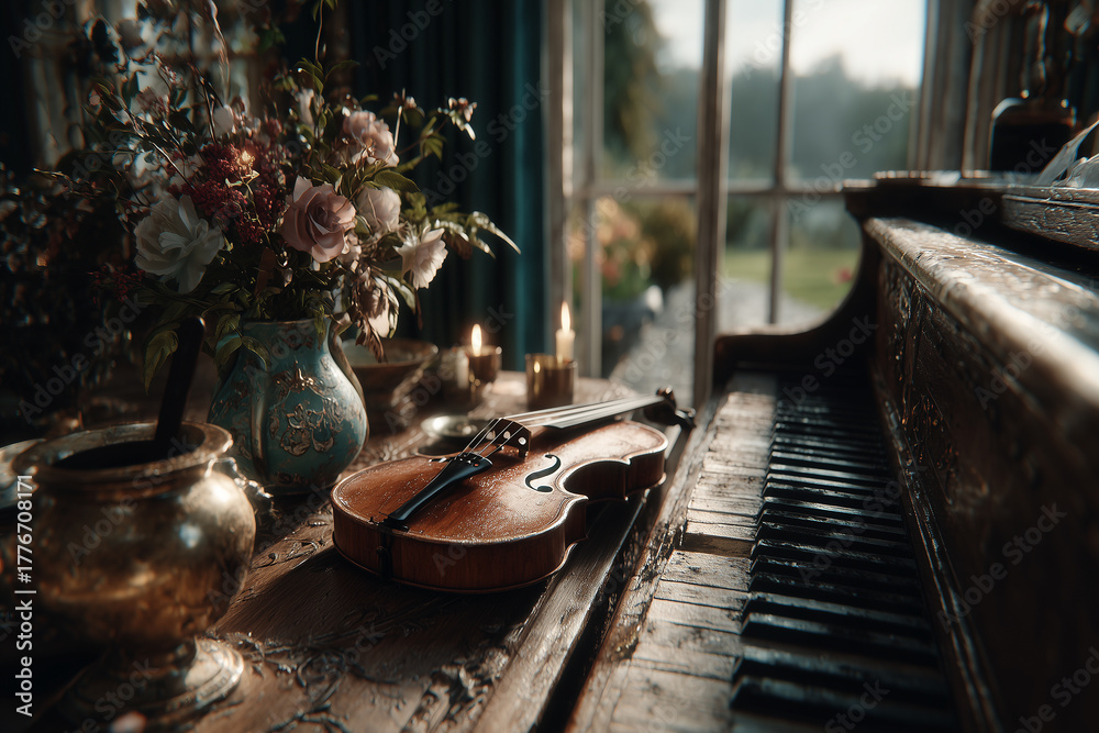 Muzyka - Martwa natura w nastrojowym świetle świec, łącząca skrzypce, bukiet róż i stare pianino, na tle... #1776708171