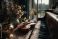 • Martwa natura w nastrojowym świetle świec, łącząca skrzypce, bukiet róż i stare pianino, na tle okna z widokiem na zamglony ogród.