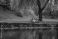 • Son and older father sitting on bench by lake and talking.
