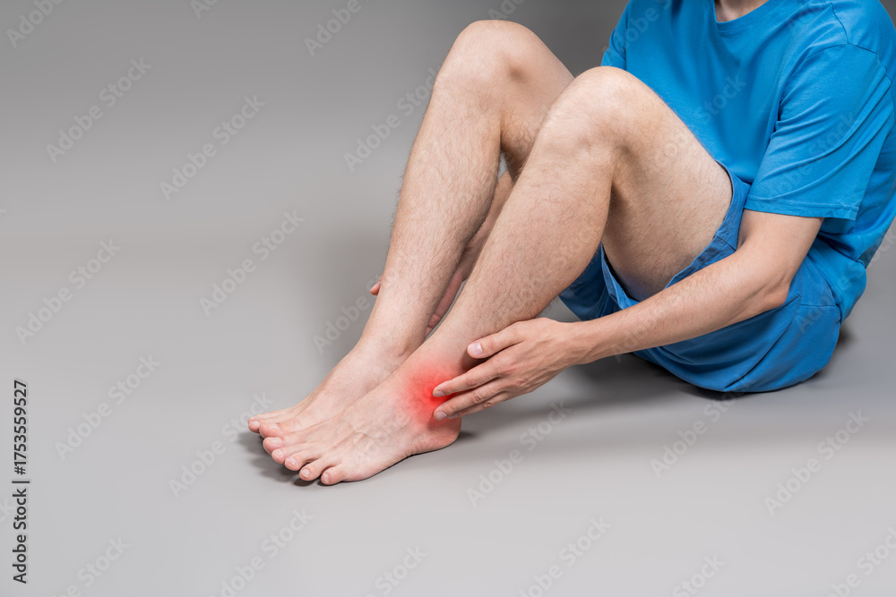 • Achilles tendon injury, joint inflammation, foot pain, man suffering from feet ache, podiatry concept