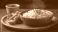 • Steaming brown rice with a side of fresh steamed vegetables and herbs on a wooden plate