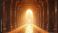 • Golden sun illuminates ornate pillars and arched hallway of ancient temple. Pathway leads to bright sanctuary. Mystical interior architecture invites peaceful contemplation and spiritual journey.
