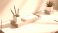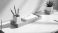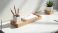• Minimalist desk setup with wooden tray organizer holding white pen cup, notepad, and pencils. A green plant in white pot sits nearby. Sunlight creates shadows on the white surface.