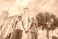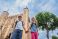 Pejzaże - Children travelers holding hands in front of historic castle #1925820054