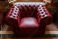 • A vintage red leather tufted armchair in Chesterfield style sits beneath an open window against a stone wall, evoking a cozy, classic and nostalgic atmosphere in a warm rustic interior setting