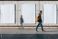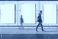 • Three blank posters hanging on a wall with a blurred figure walking past, ready for advertisement