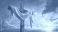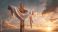 • Wooden Christian Cross with White Cloth at Sunrise as Symbol of Resurrection