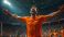 • Man celebrates victory arms outstretched in stadium. Excited crowd cheers wearing orange shirts, confetti falls. Sports player feels euphoric after winning game.