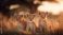 • Three lion cubs sitting in golden light, portrait of adorable feline siblings in african landscape