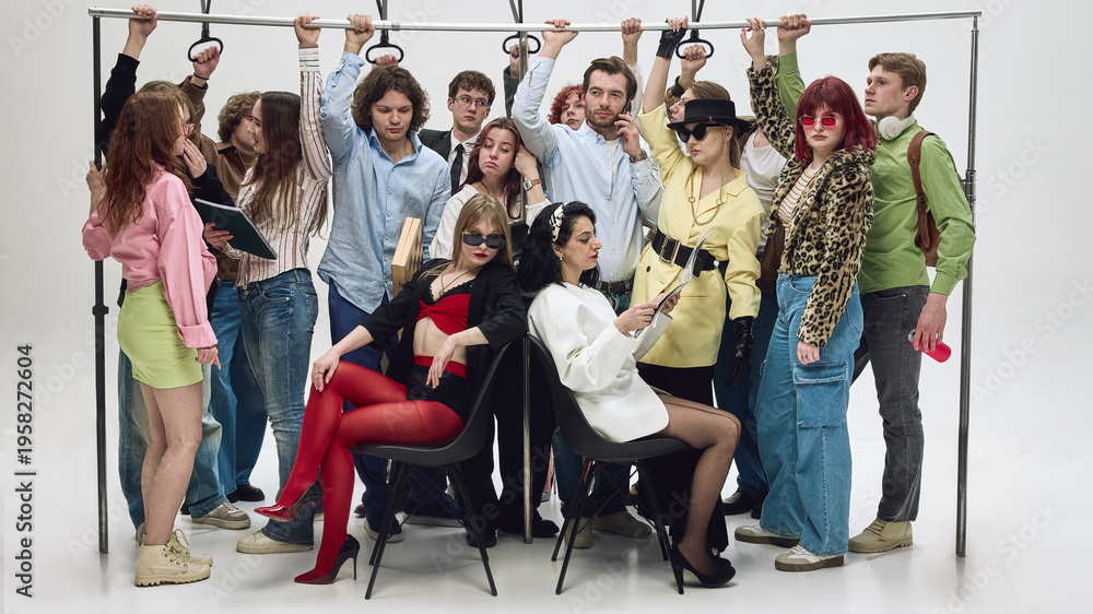 • Crowded group of people holding handrails standing tightly in subway carriage. Concept of rush hour commute, urban transport pressure, overcrowding problem, and daily city life.