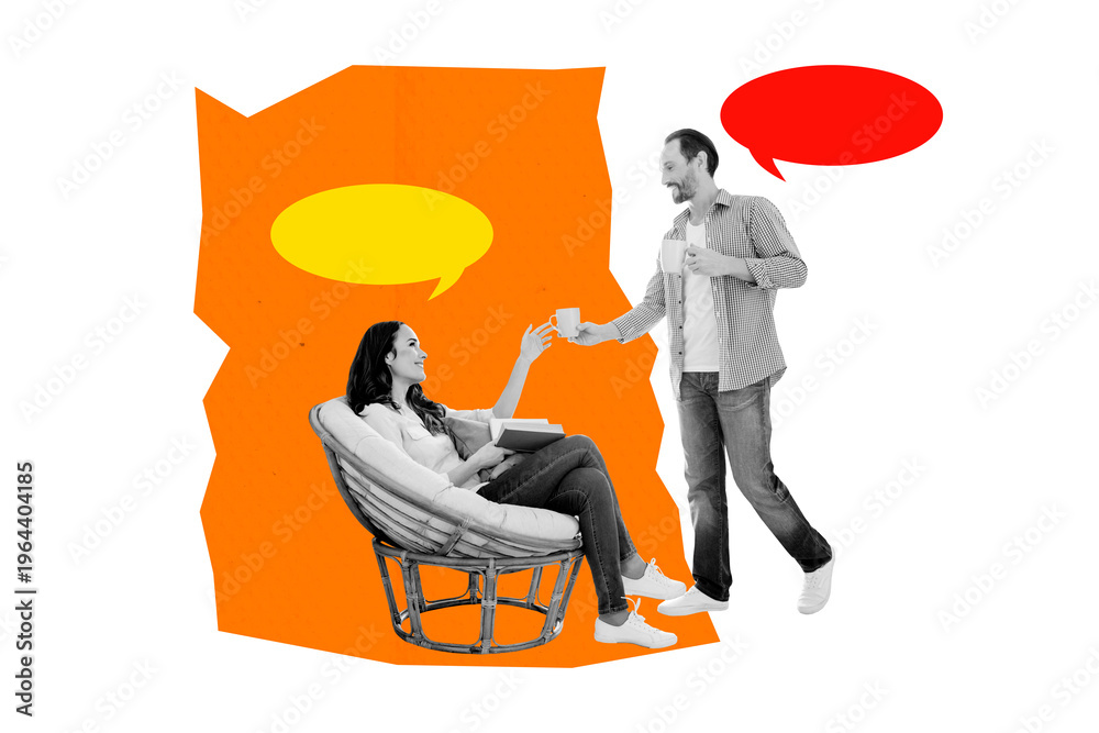 • Composite creative art collage of two happy girl guy hold coffee cup beverage bubble communication phrase isolated on painted background
