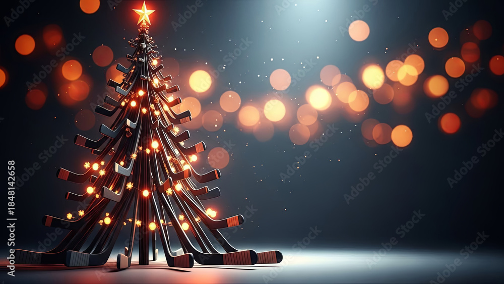 • Christmas tree made from hockey sticks with shining star and bokeh background for Winter sports holiday celebration design.