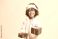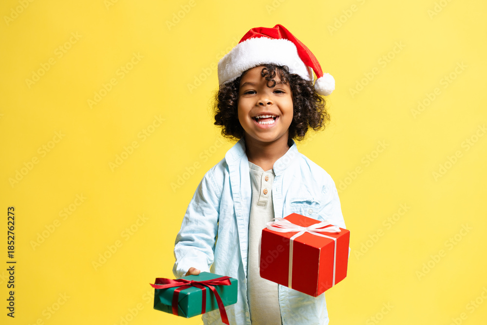 • Happy boy in Santa hat holding Christmas gifts on yellow background